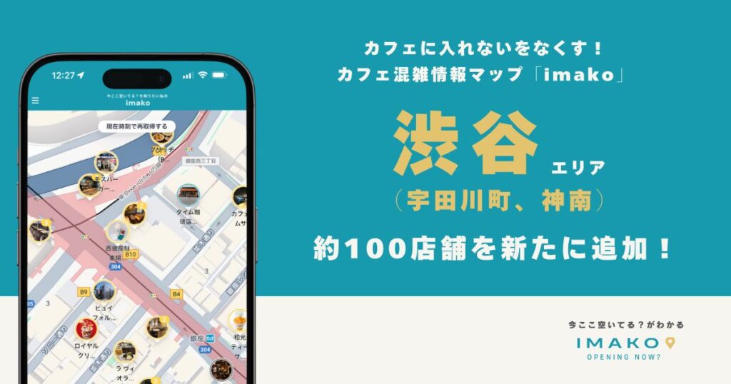 株式会社imako(本社:東京都渋谷区、代表取締役: 浜田真衣 以下、imako)は、「今ここ空いてる?がわかる」カフェ混雑情報マップimako(いまこ)に、新たに「渋谷エリア(宇田川町、神南、神山町)」エリア、約100店舗が追加されたことをお知らせします。