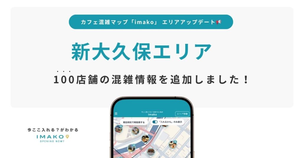 株式会社imako(本社:東京都渋谷区、代表取締役:浜田真衣 以下、imako)は、「今ここ入れる?がわかる」カフェ混雑情報マップ「imako(いまこ)」に、新たに新大久保エリアの約100店舗を追加したことをお知らせいたします。